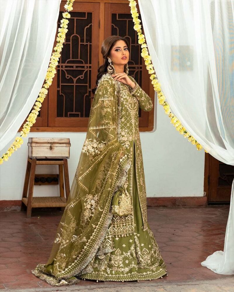Step into elegance and sophistication with the Rozhin by Faiza Saqlain bridal ensemble, exclusively available at the Mwish Store. Crafted for brides who seek the perfect combination of traditional charm and modern flair, this olive green Pakistani wedding dress 2025 is designed to elevate your special day with luxurious fabrics, intricate embroidery, and timeless beauty. Perfect for bridal wear, party wear, or your Pakistani mehndi dress, Rozhin promises to make you the center of attention at any event.